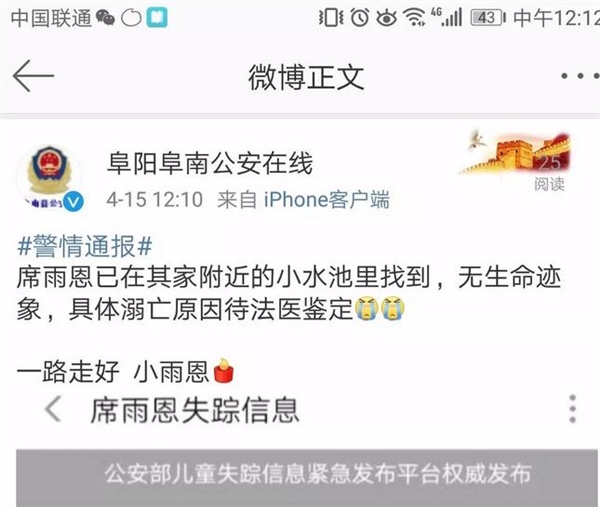 让所有阜阳人牵挂的 2 岁女孩席雨恩找到了,结局令人心痛···