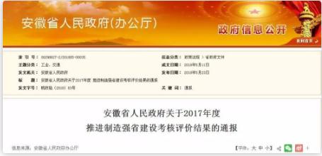 前天,安徽省人民政府公布了2017年度 推进制造强省建设考核评价结果的通报。